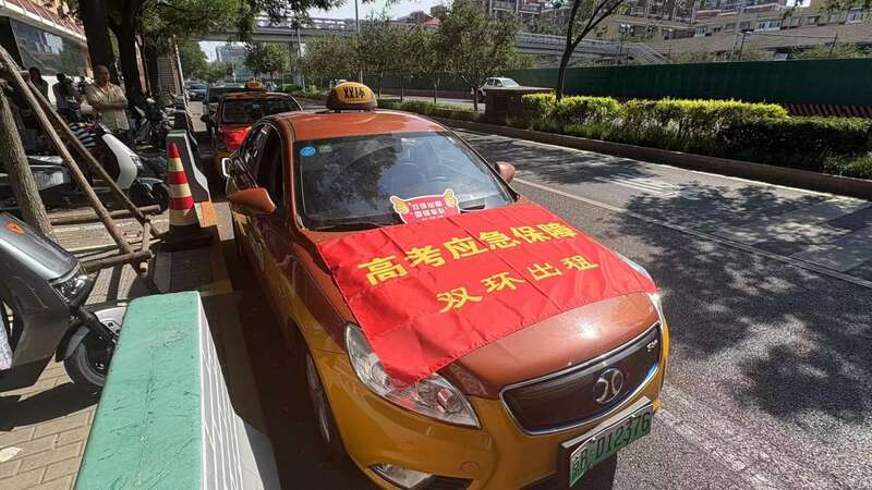 北京市第十五中学考点外,两辆由出租车改装的“高考应急保障服务车”停在路边随时准备为遇到突发状况的考生提供紧急服务。这是北京双环出租汽车公司连续第三年派出党员和志愿者组成车队,在考点附近提供志愿服务。