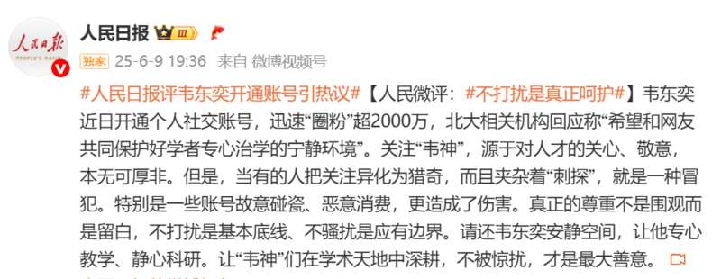 @人民日报 指出:关注“韦神”,源于对人才的关心、敬意,本无可厚非。但是,当有的人把关注异化为猎奇,而且夹杂着“刺探”,就是一种冒犯。特别是一些账号故意碰瓷、恶意消费,更造成了伤害。