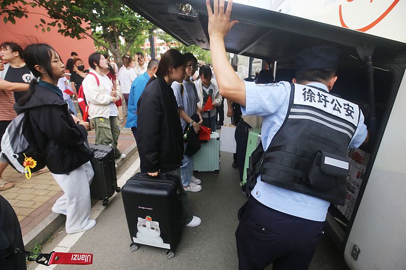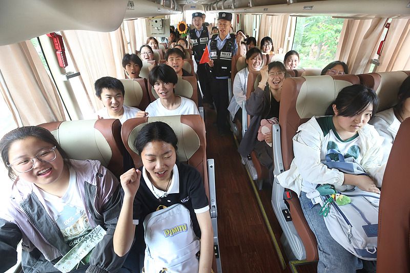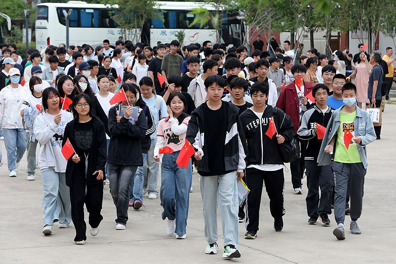 2025年6月13日,江苏连云港,学生们手持小国旗,准备乘车前往市区参加中考。