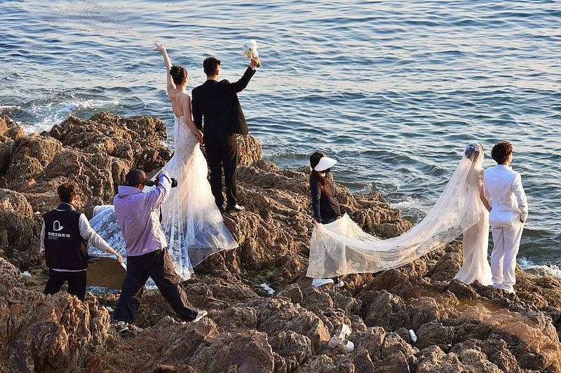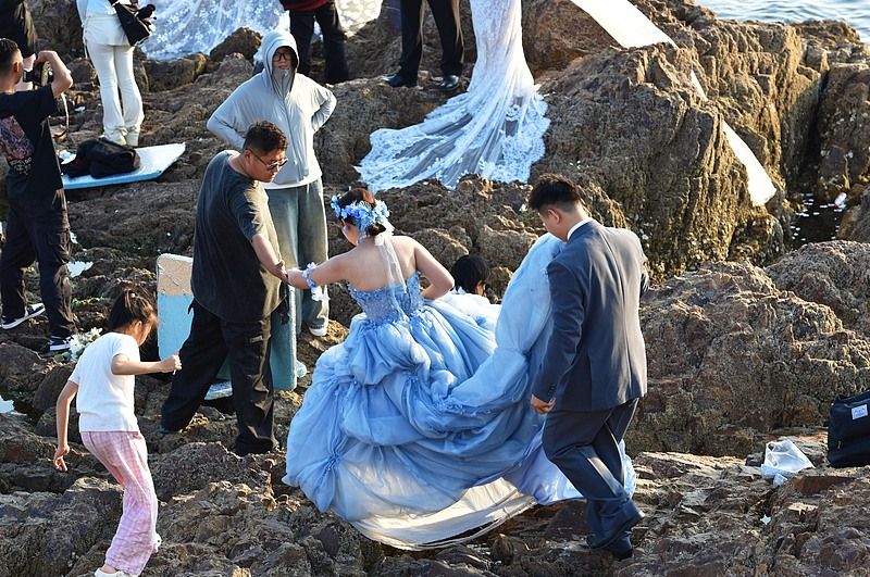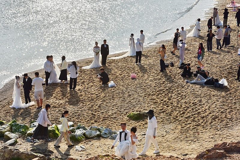 2025年6月12日,辽宁大连,南部海滨阳光下的海滩风和日丽。来自国内各地的一对对恋人和游客纷至沓来到这里打卡拍照,滨城迎来婚纱旅拍热季。