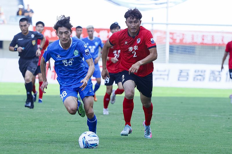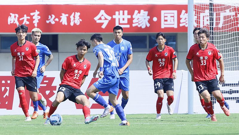 2025年6月14日,南京队员和淮安队员在比赛中拼抢。
