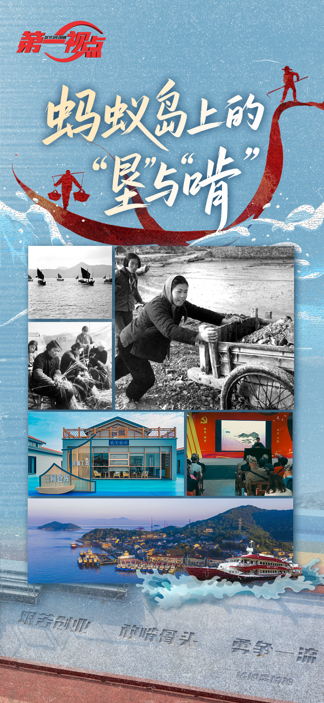 “鱼儿难捕租税重,捕鱼人儿世世穷。”一首民谣唱尽了蚂蚁岛解放前的困苦。搓草绳、撑大船、筑海塘……不服输的蚂蚁岛人向远洋讨生活,成为全国艰苦创业先进典型。
