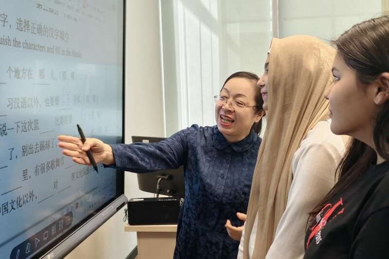 在分校的视听说教室里,当地学生跟着中国老师有节奏地吟诵,品味经典中国古诗词中的韵味,感受中国文化的魅力。课堂上,学生们又将哈萨克斯坦同样关于“友谊”的表达翻译成中文,在分享与互动中,提升中文能力,增进相互理解。