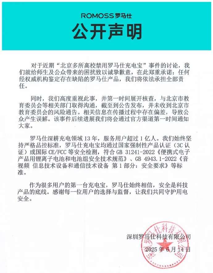 6月14日,@ROMOSS罗马仕 回应北京多所高校禁用罗马仕充电宝事件:就给师生及公众带来的困扰致以诚挚歉意。