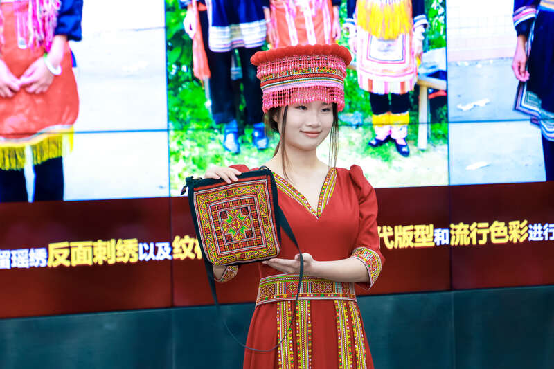 广东外语外贸大学瑶篮瑶绣实践团成员展示改良瑶绣服饰。主办方供图