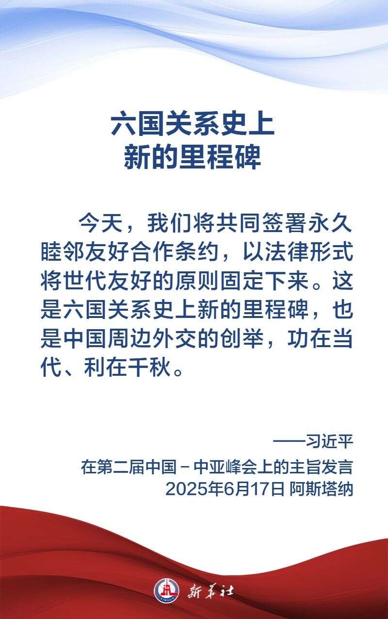 当地时间6月17日下午,第二届中国-中亚峰会在哈萨克斯坦首都阿斯塔纳独立宫举行。国家主席习近平同中亚五国元首一致决定弘扬“中国-中亚精神”,坚持永久睦邻友好,携手推动中国-中亚命运共同体建设不断取得新成就,习近平发表题为《弘扬“中国-中亚精神” 推动地区合作高质量发展》的主旨发言,对弘扬“中国-中亚精神”作出深刻阐述——