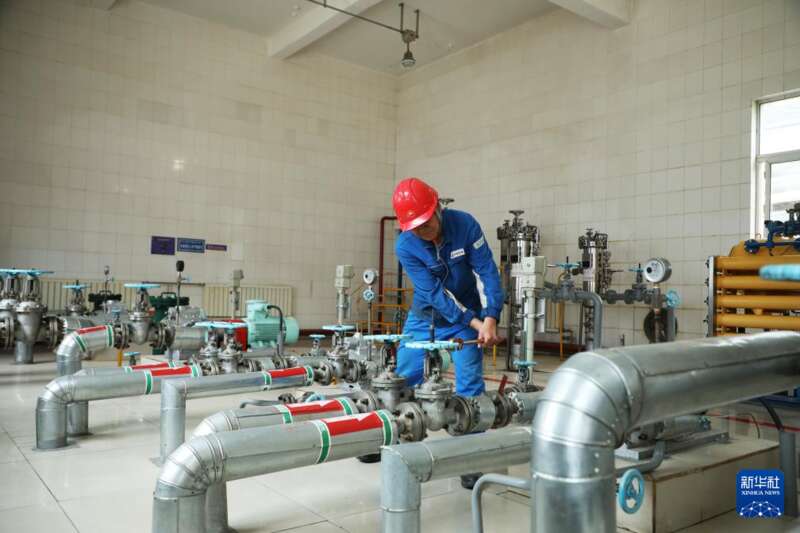 在中石油玉门油田分公司炼油化工总厂,工人在检查设备(2025年5月22日摄)。新华社记者 张智敏 摄
