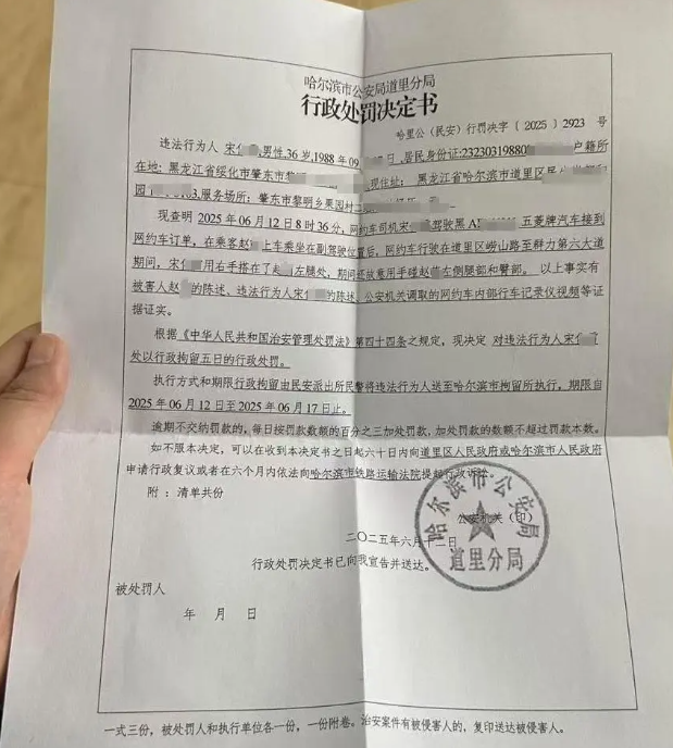 赵女士提供的哈尔滨市公安局道里区分局《行政处罚决定书》显示,猥亵她的T3平台网约车司机宋某某已被警方行政拘留5天。