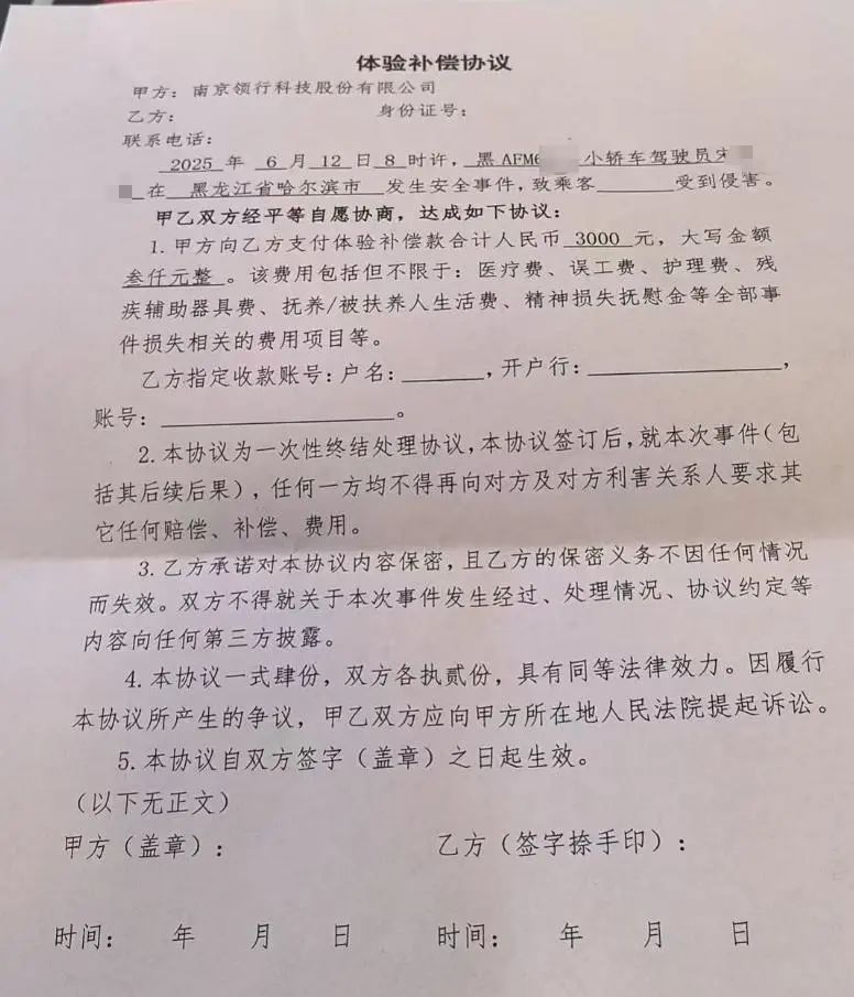 据悉,事发后,T3出行平台工作人员联系赵女士,表示要赔偿,但要求赵女士收到3000元后签署协议,承诺不得向任何第三方透露这个消息,也不得再向对方及对方利害关系人要求其他任何赔偿、补偿、费用。
