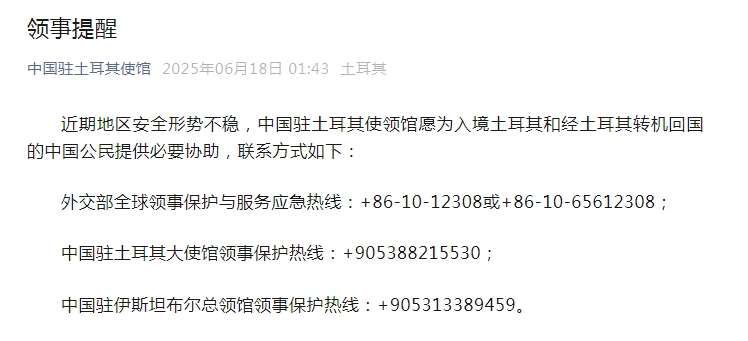 中新网6月18日电 中国驻土耳其使馆6月18日发布领事提醒:近期地区安全形势不稳,中国驻土耳其使领馆愿为入境土耳其和经土耳其转机回国的中国公民提供必要协助,联系方式如下: