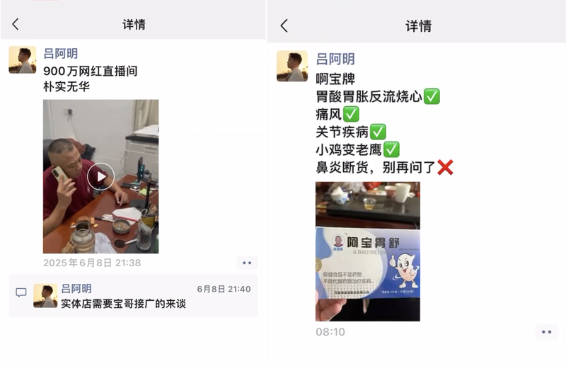 卢先生称,他从2023年8月开始关注“啊宝”抖音账户。2024年9月,他听说“啊宝”在朋友圈卖一款名为“阿宝胃舒”的胃药,同年10月,他加上“啊宝”助理张某的微信,12月,又添加了“啊宝”本人的微信。