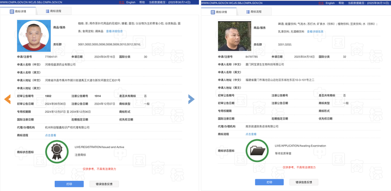 商标信息显示,2025年4月18日,该公司将何火宝接受媒体采访时的头像截图,申请为图形商标,目前正等待实质审查。该商标的国际分类为啤酒、能量饮料、气泡水等。