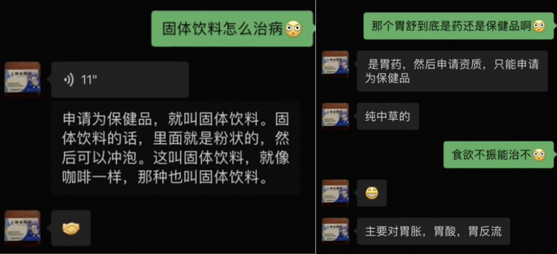 卢先生私聊询问张某,卖的是保健品还是药物。对方回复说是纯中药,“这是胃药,然后申请资质,只能申请为保健品。”卢先生质疑,“固体饮料”如何治病?对方称,“申请为保健品,就叫固体饮料。”