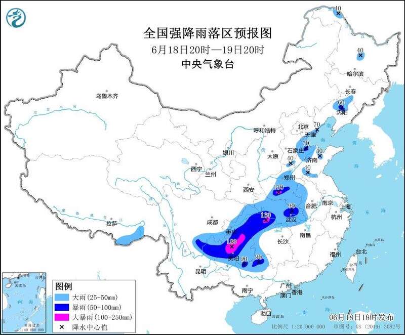 预计,6月18日20时至19日20时,贵州、四川南部和东部、重庆、广西北部、湖北、湖南西部和北部、河南中东部以及河北东部和南部、山东中西部、天津南部、辽宁北部等地部分地区有大到暴雨,其中,河南中部、湖北西南部、湖南西北部、贵州中北部等地部分地区有大暴雨(100~180毫米)。上述部分地区伴有短时强降水(最大小时降雨量20~50毫米,局地可超过80毫米),局地有雷暴大风等强对流天气。