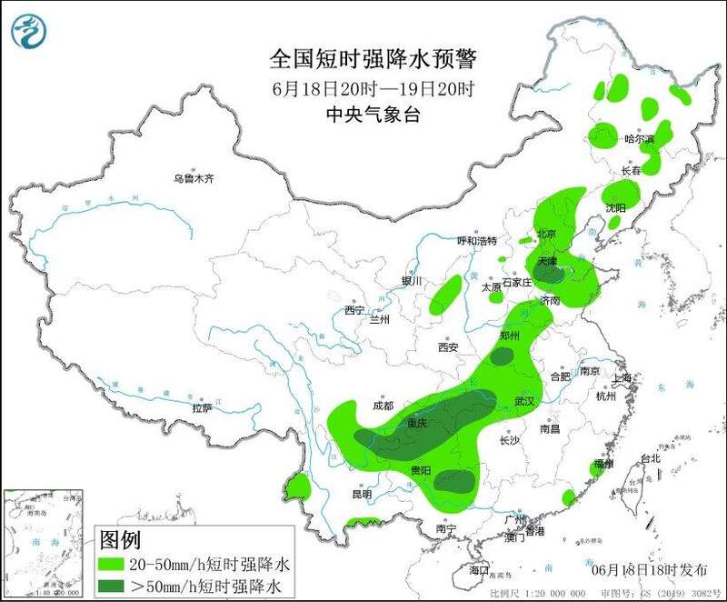 预计6月18日20时至19日20时,内蒙古东南部、东北地区西部、华北东部和南部、黄淮西部和北部、江汉、西南地区东部等地的部分地区将有8级以上雷暴大风或冰雹天气,其中,内蒙古东南部、河北东部、天津北部、山东北部等地的部分地区将有10级以上雷暴大风,最大风力可达11级以上;内蒙古东部、东北地区中西部和南部、华北中东部、黄淮、江淮西部、江汉、江南西部、西南地区东部、华南北部等地的部分地区将有小时雨量大于20毫米的短时强降水天气,其中,河北东南部、山东北部、河南南部、湖北西南部、湖南西北部、四川东南部、重庆南部、贵州北部、云南东北部、广西北部等地的部分地区小时雨量大于50毫米,最大可达80毫米以上。