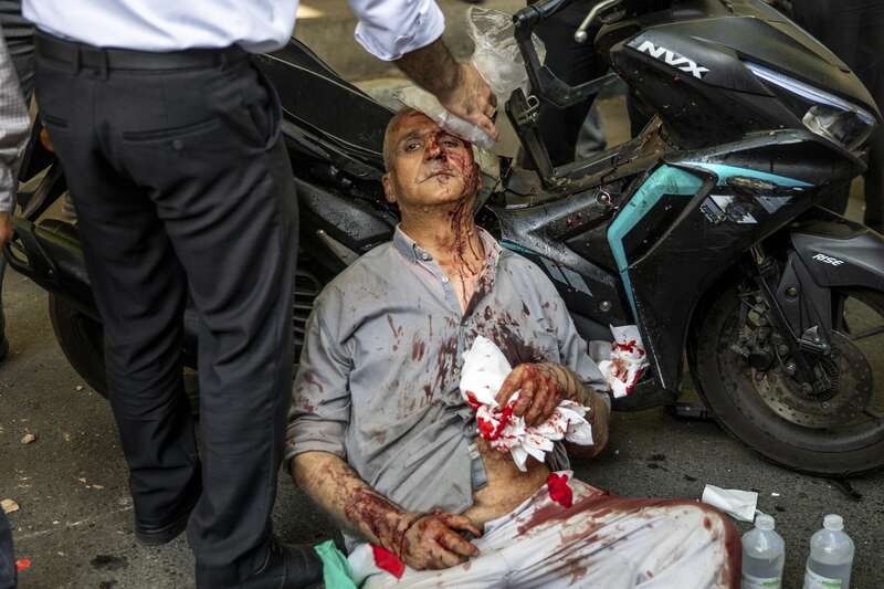 6月15日,伊朗德黑兰,以色列对伊朗发动为期三天的袭击,市中心发生爆炸,一名伤者在爆炸后接受救助。视觉中国供图