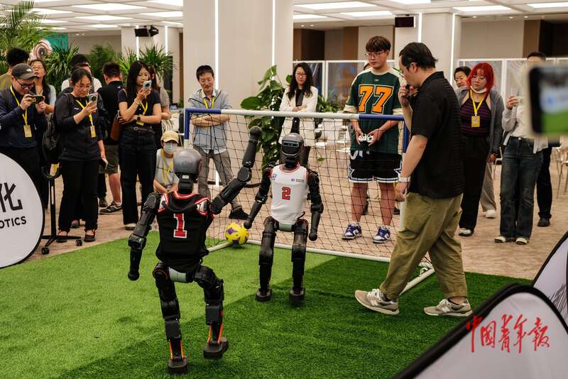 6月17日,北京机器人大世界,两个机器人正在进行足球赛。当日,记者跟随“活力中国调研行”主题采访活动来到这里,感受机器人产业的创新发展。中青报·中青网记者 赵迪/摄