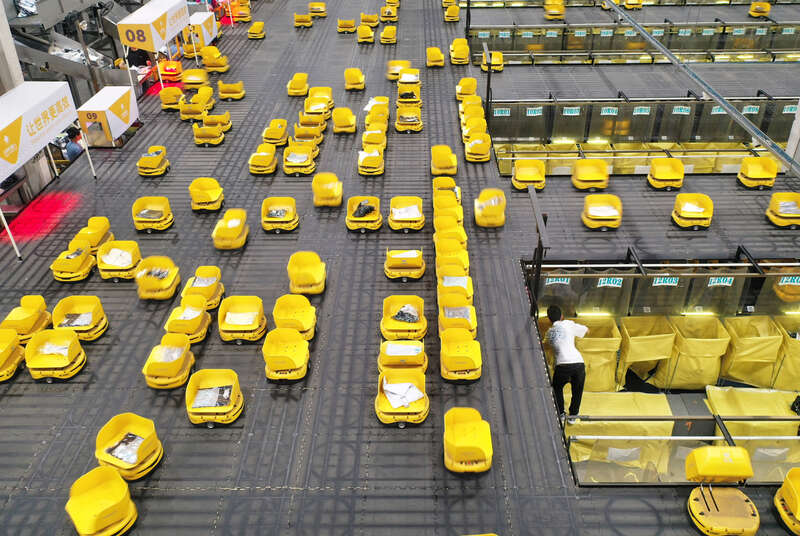 6月14日,浙江湖州德清,乾元镇第一产业智慧物流园区快鱼服饰有限公司华东物流中心,880台分拣机器人正在配送服饰。视觉中国供图