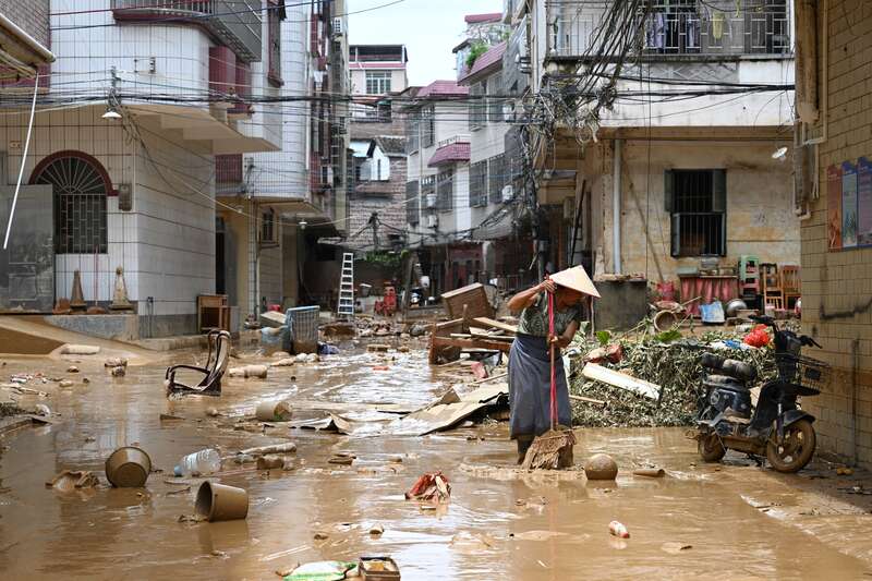 6月19日,广东省肇庆市怀集县的居民在清理杂物和淤泥。近日,受台风“蝴蝶”及高空槽和季风共同影响,怀集县遭遇持续性强降雨侵袭,江河水位快速上涨,多地出现超警戒洪水及内涝等险情。视觉中国供图