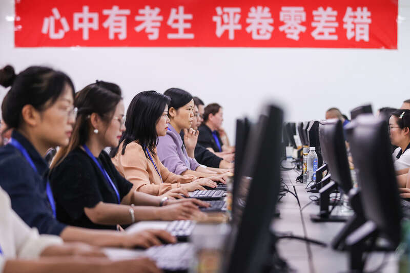 6月15日,贵州省贵阳市,评卷老师进行电脑阅卷。当日,贵州省招生考试院在贵州师范大学高考评卷基地举行2025年高考“评卷开放日”活动,媒体代表和公开征集的部分考生及家长代表走进评卷现场参观、了解评卷流程。视觉中国供图