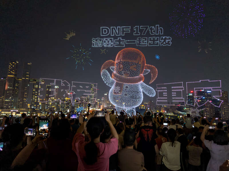 6月17日,重庆,两江四岸上演万架无人机表演挑战吉尼斯纪录,众多市民和游客前往观看。当日,为庆祝重庆市直辖28周年,“魅力重庆”万架无人机表演于21:00在两江四岸上演,吸引众多游客和市民前往观看。视觉中国供图