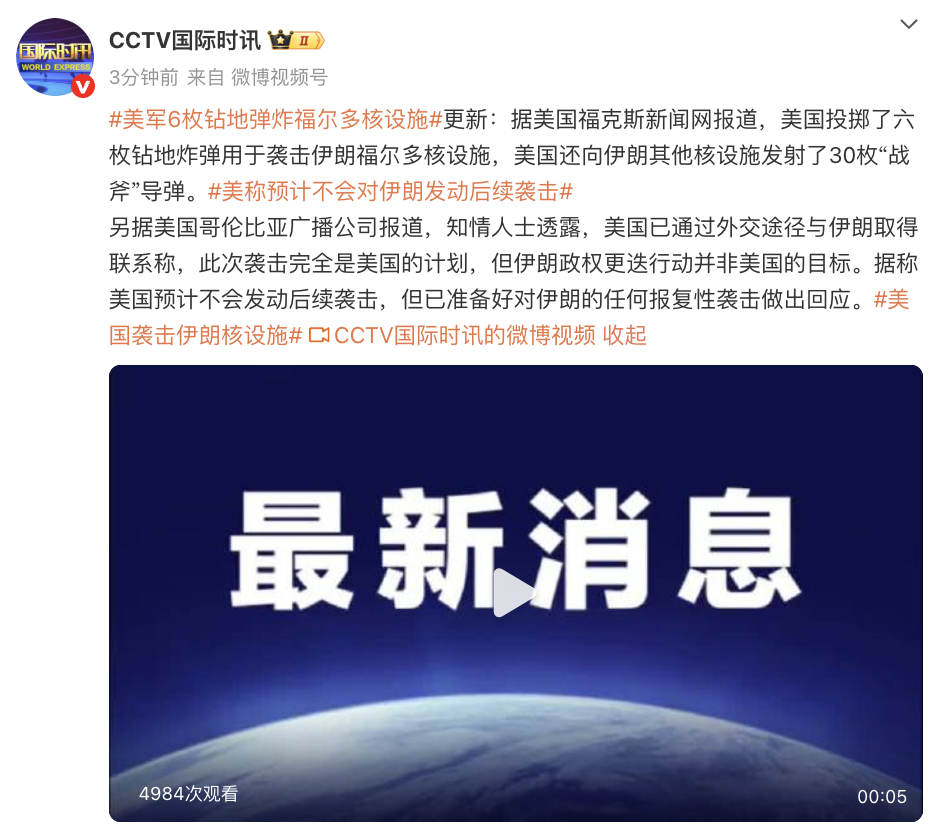 另据美国哥伦比亚广播公司报道,知情人士透露,美国已通过外交途径与伊朗取得联系称,此次袭击完全是美国的计划,但伊朗政权更迭行动并非美国的目标。据称美国预计不会发动后续袭击,但已准备好对伊朗的任何报复性袭击做出回应。