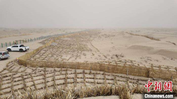 站在工程区域内的沙丘上,记者看到,草方格和高立式沙障纵横交错,即使狂风肆虐,沙障周边的黄沙依然保持“平静”,被牢牢“钉”在原处。