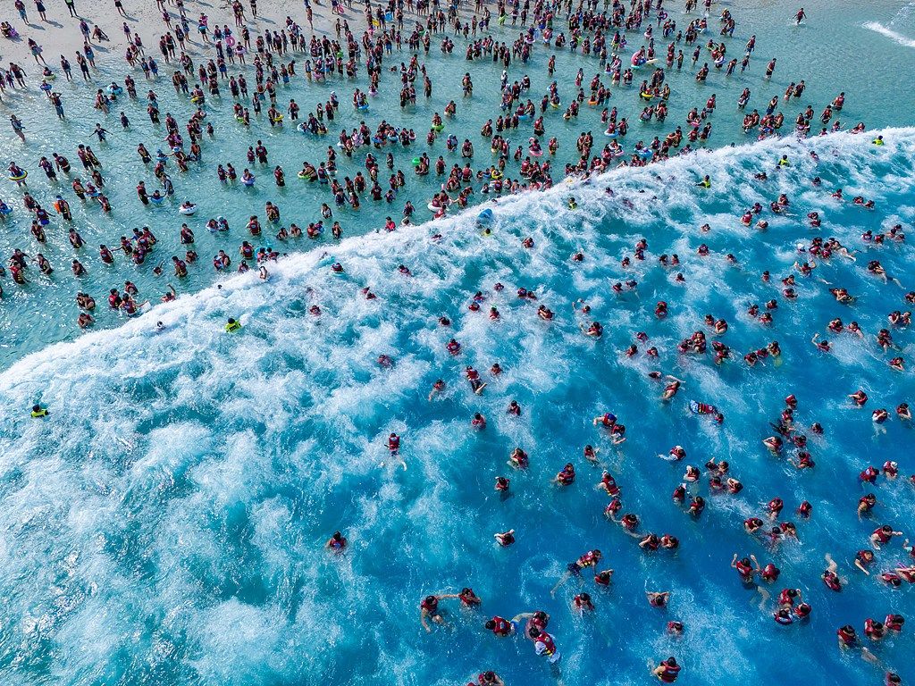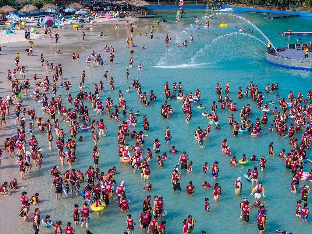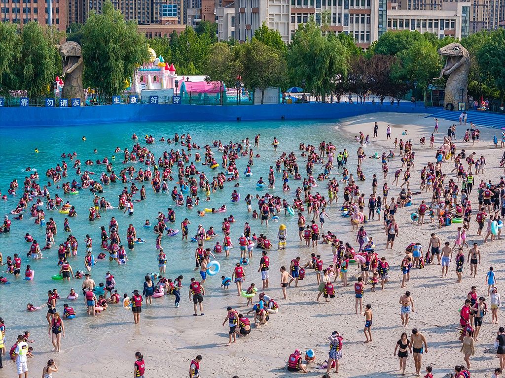 2025年6月21日,河南郑州,夏季高温天气,市民、游客到水上乐园消暑享清凉,尤其是在“大海啸”人工造浪池,人山人海。