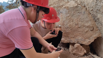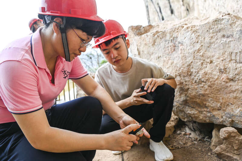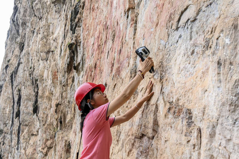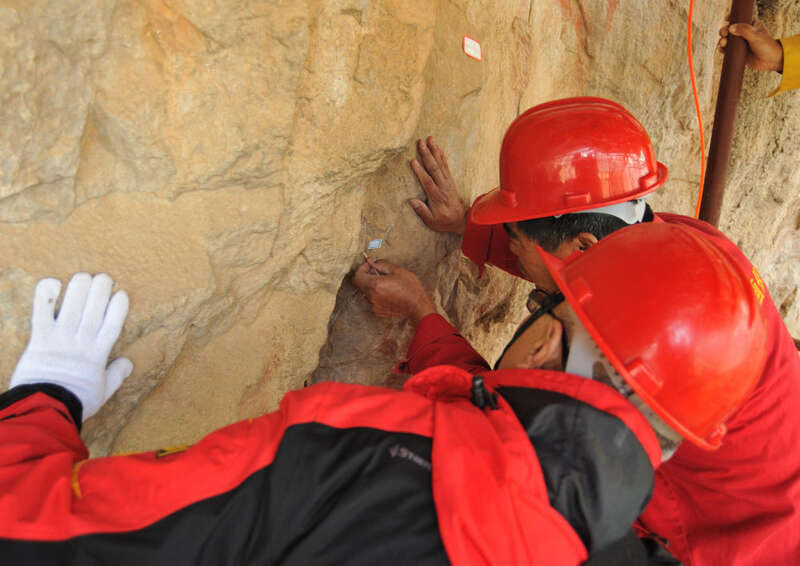 ↑6月19日,在位于广西宁明县的一处花山岩画,工作人员对风化崩落的岩石进行检测。