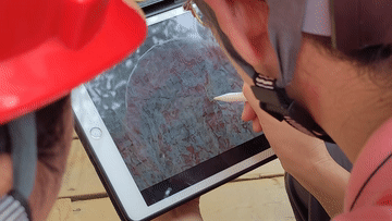↑6月19日,在位于广西宁明县的一处花山岩画,工作人员对数字岩画进行补全。