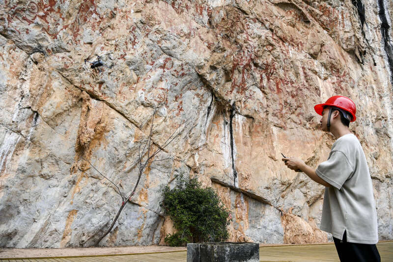 ↑6月19日,在位于广西宁明县的一处花山岩画,工作人员使用无人机对岩壁进行拍照。