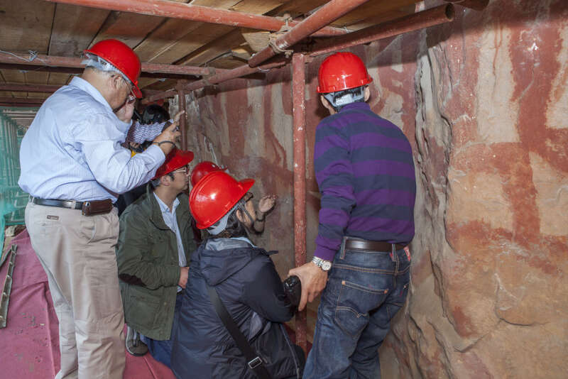 ↑2013年11月19日,在位于广西宁明县的一处花山岩画,技术人员在现场讨论修复方案。