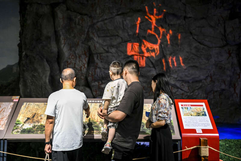↑6月21日,在广西南宁的广西民族博物馆,游客了解花山岩画的背景信息。