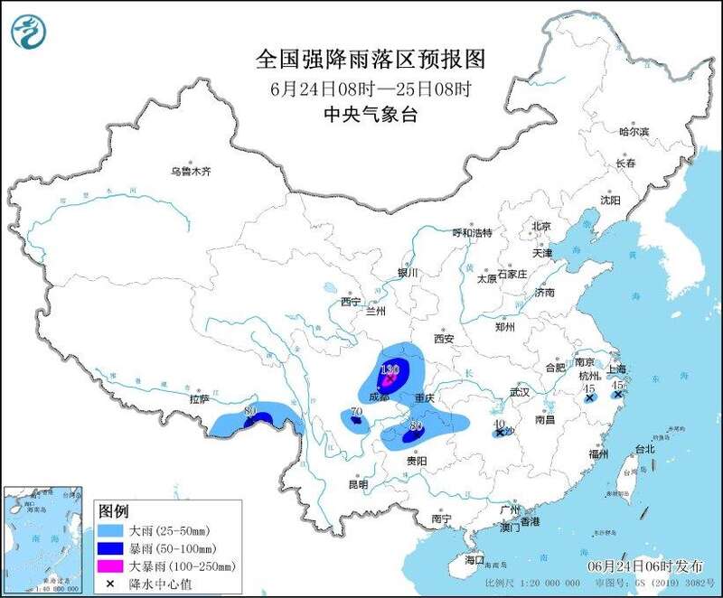 预计,6月24日08时至25日08时,甘肃南部、陕西西南部、四川盆地大部、川西高原南部、贵州北部、湖南西部和中部、西藏东南部、云南西北部等地部分地区有大到暴雨,其中,四川盆地西北部等地局地有大暴雨(100~130毫米)。上述部分地区伴有短时强降水(最大小时降雨量20~50毫米,局地可超过60毫米),局地有雷暴大风等强对流天气。