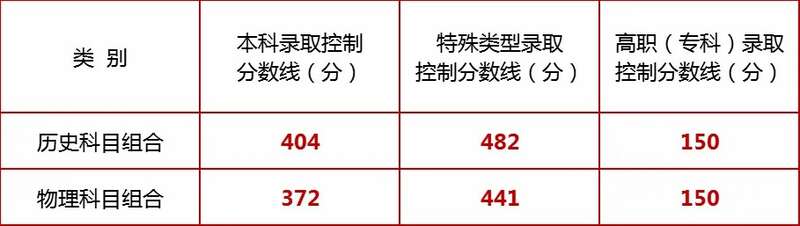 历史类本科线为404分,物理类本科线为372分,专科线均为150分。