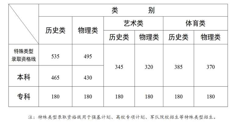 特殊类型录取资格线:物理组合483分;历史组合517分。