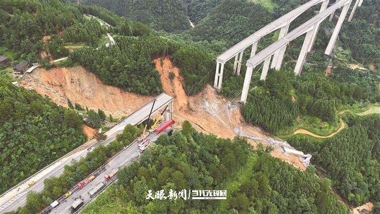 6月24日,因持续强降雨诱发山体滑坡,导致G76厦蓉高速格都线广西至贵州都匀方向K1264处猴子河特大桥引桥发生垮塌。目前,经现场排查,事发区域的新合村千秋四组群众10户17人,以及邻近村寨26户36人,均已安全转移安置。