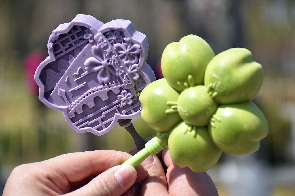 北京玉渊潭公园,游客在手持樱花雪糕与樱树樱花合影。(2023年3月26日)