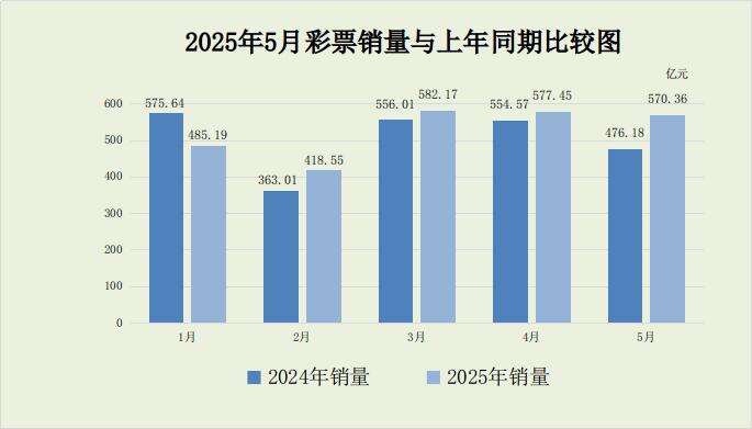 5月份,全国共销售彩票570.36亿元,同比增加94.18亿元,增长19.8%,主要原因是5月份体育赛事较多带动竞猜型彩票销量增长,以及去年同期即开型彩票销量基数较低等。其中,福利彩票机构销售185.29亿元,同比增加14.71亿元,增长8.6%;体育彩票机构销售385.07亿元,同比增加79.47亿元,增长26.0%。