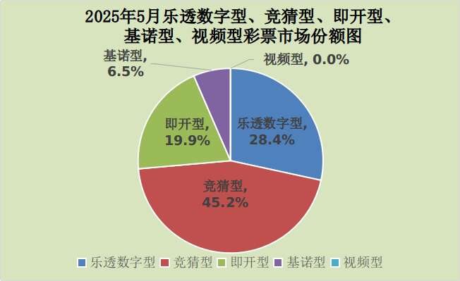 1-5月累计,乐透数字型彩票销售740.78亿元,同比减少8.90亿元,下降1.2%;竞猜型彩票销售1159.34亿元,同比增加111.31亿元,增长10.6%;即开型彩票销售567.84亿元,同比增加10.69亿元,增长1.9%;基诺型彩票销售165.76亿元,同比减少4.78亿元,下降2.8%。1-5月,乐透数字型、竞猜型、即开型、基诺型彩票销售量分别占彩票销售总量的28.1%、44.0%、21.6%、6.3%。视频型彩票销售0.0054亿元,同比减少0.0005亿元。
