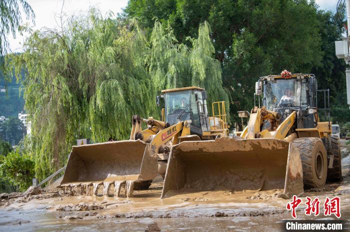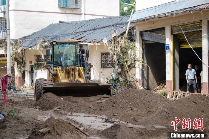 6月25日,从江县城区,工作人员驾驶铲车清理街道淤泥。吴德军 摄