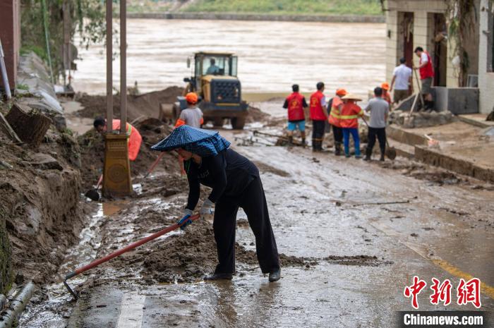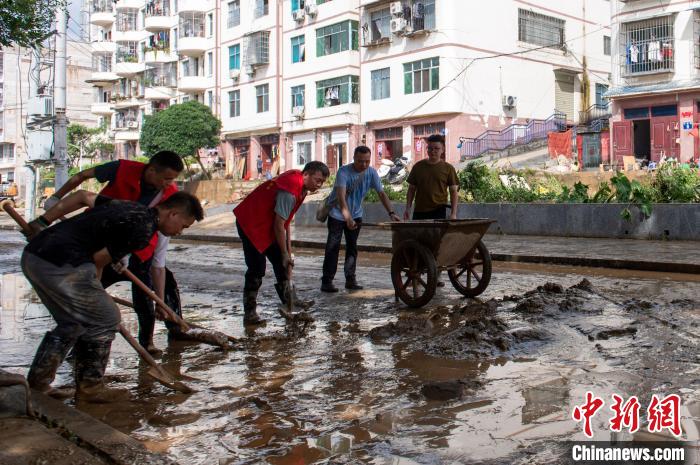 6月25日,从江县城区,党员和干部群众齐力清理街道淤泥。吴德军 摄