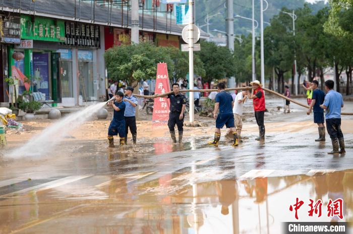 6月25日,随着都柳江水位平稳下降,贵州省黔东南苗族侗族自治州从江县积极开展清淤消杀工作,帮助民众恢复正常的生活和生产。图为在从江县城区,党员和干部群众齐力清理街道淤泥。吴德军 摄