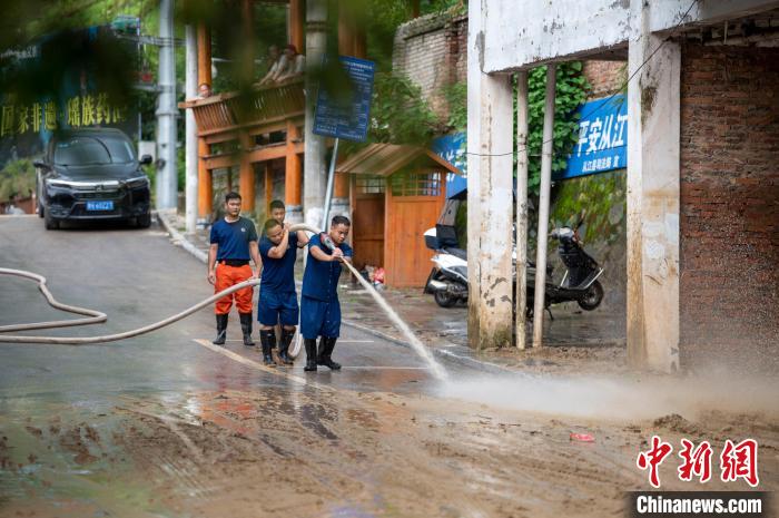 6月25日,从江县城区,党员和干部群众用水枪清洗街道。吴德军 摄