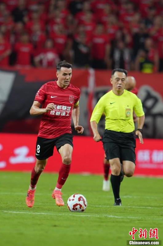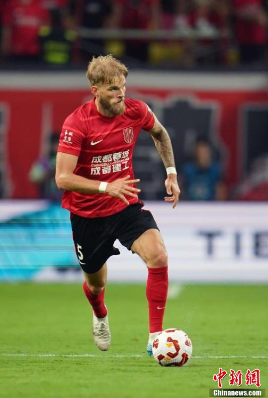 6月25日晚,四川成都,成都蓉城队队员提莫·莱切特(红衣)在比赛中。中新社记者 安源 摄