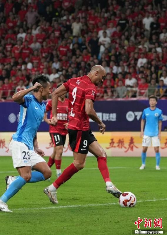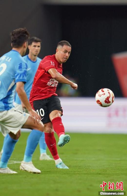 6月25日晚,四川成都,成都蓉城队队员古尔芬克尔(红衣)在比赛中。中新社记者 安源 摄