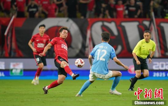6月25日晚,四川成都,成都蓉城队队员周定洋(红衣)在比赛中。当日,2025赛季中超联赛第15轮比赛中,成都蓉城队主场5比0胜深圳新鹏城队。中新社记者 安源 摄