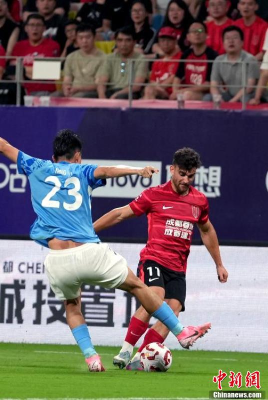 6月25日晚,四川成都,成都蓉城队队员费利佩(红衣)在比赛中。中新社记者 安源 摄