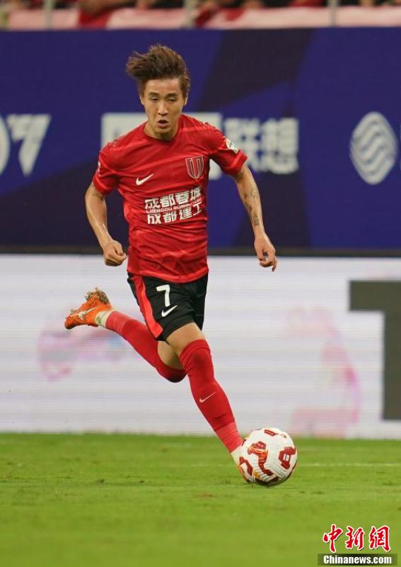 6月25日晚,四川成都,成都蓉城队队员韦世豪(红衣)在比赛中。中新社记者 安源 摄