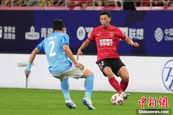 6月25日晚,四川成都,成都蓉城队队员李扬(红衣)在比赛中。中新社记者 安源 摄